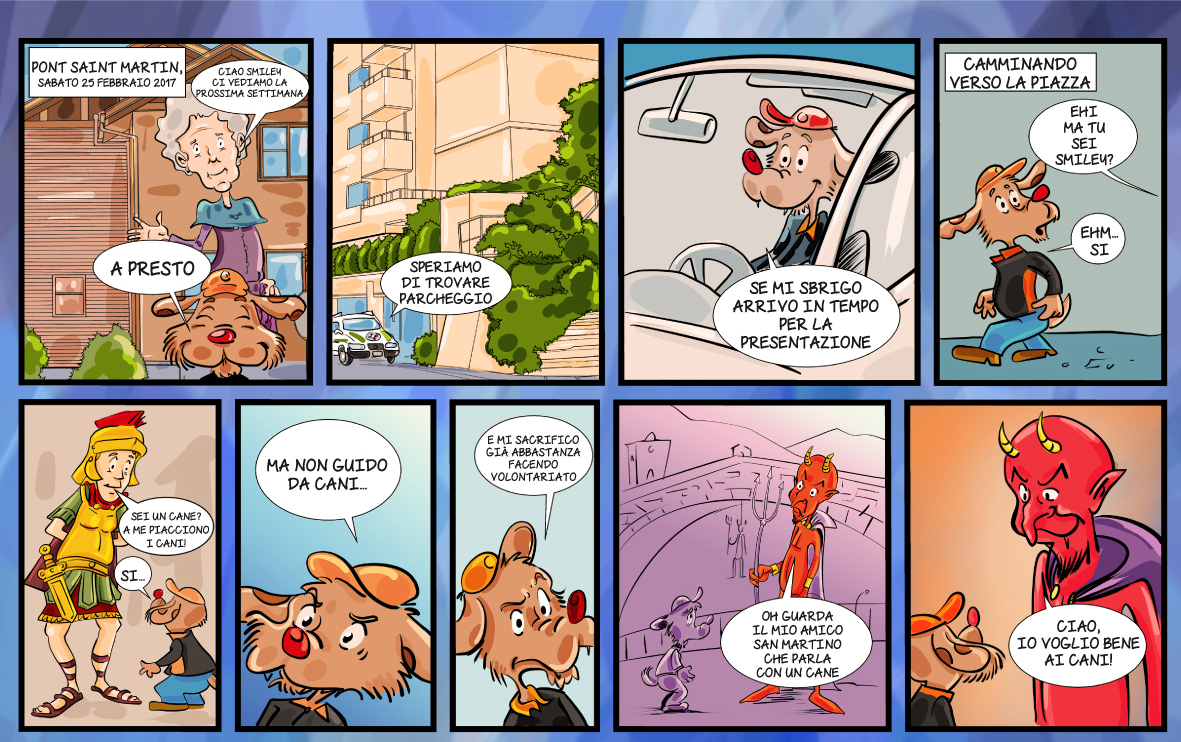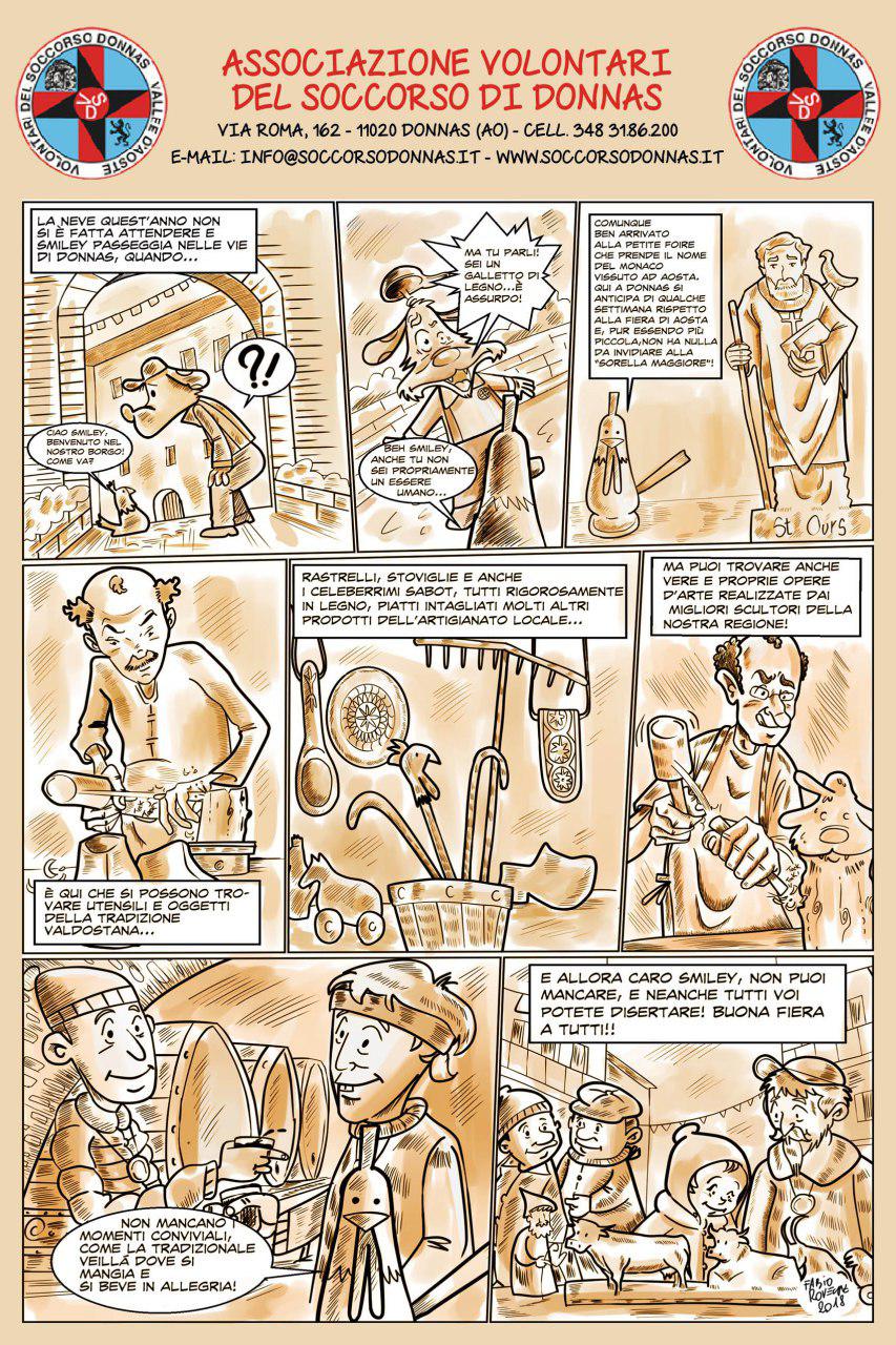 Dalla matita di Fabio Roveyaz, i manifestini con le avventure di Smiley: strisce di vignette che raccontano in modo semplice e divertente cosa significa far parte dei Volontari del Soccorso di Donnas.