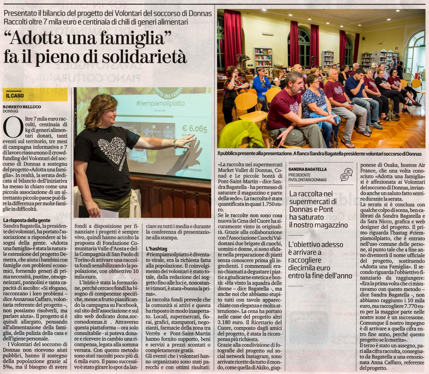 Sandra Bagatella, la presidente dei volontari, ha portato l'associazione a rispondere ai bisogni della gente. «Adotta una famiglia» è stata la naturale estensione del progetto Demetra, che aiuta i bambini con famiglie con problemi economici, fornendo generi di prima necessità, pastine, omogeneizzati, pannolini e tanta capacità di ascolto: «Si sfogano, raccontano i loro problemi dice Annarosa Caffaro, volontaria referente del progetto , non possiamo risolverli, ma parlare aiuta». Il progetto si è quindi allargato, pensando all'alimentazione della famiglia, della pulizia della casa e dell'igiene personale. I Volontari del soccorso di Donnas non ricevono aiuti pubblici, hanno il sostegno della popolazione grazie al 5%o, ma il bisogno di avere fondi a disposizione per finanziare i progetti è sempre vivo, quindi hanno accolto la proposta di Fondazione Comunitaria Valle d'Aosta e della Compagnia di San Paolo di Torino di attivare una raccolta fondi sensibilizzando la popolazione, con obbiettivo 10 mila euro. L'inizio è stata la formazione, perché cercare fondi ha bisogno di competenze specifiche, messe a frutto pianificando la campagna su Facebook, sul sito dell'associazione e sul sito web dedicato dona.soccorsodonnas.it . Attraverso questa piattaforma —ora solo consultabile - si poteva donare e ricevere in cambio una ricompensa, legata alla somma versata. Con questo metodo sono stati raccolti poco più di 6 mila euro. Il passo successivo è stato tirare lo spot da lanciare su tutti i media e durante la conferenza di presentazione alla stampa.