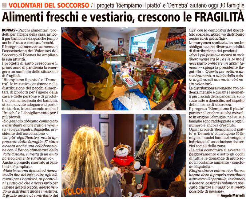 DONNAS - Pacchi alimentari, prodotti per l'igiene della casa, articoli per bambini e da qualche tempo anche frutta e verdura freschi. Il bisogno alimentare aumenta e l'associazione dei Volontari del Soccorso di Donnas ha ampliato la sua attività. I progetti di aiuto crescono e il primo anno di pandemia fa emergere un aumento delle situazioni di fragilità.
