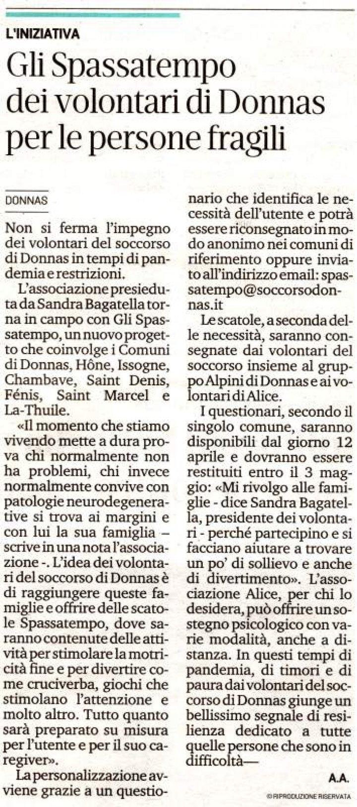 «Il momento che stiamo vivendo mette a dura prova chi normalmente non ha problemi, chi invece normalmente convive con patologie neurodegenerative si trova ai margini e con lui la sua famiglia —scrive in una nota l'associazione -. L'idea dei volontari del soccorso di Donnas è di raggiungere queste famiglie e offrire delle scatole Spassatempo, dove saranno contenute delle attività per stimolare la motricità fine e per divertire come cruciverba, giochi che stimolano l'attenzione e molto altro. Tutto quanto sarà preparato su misura per l'utente e per il suo caregiver».