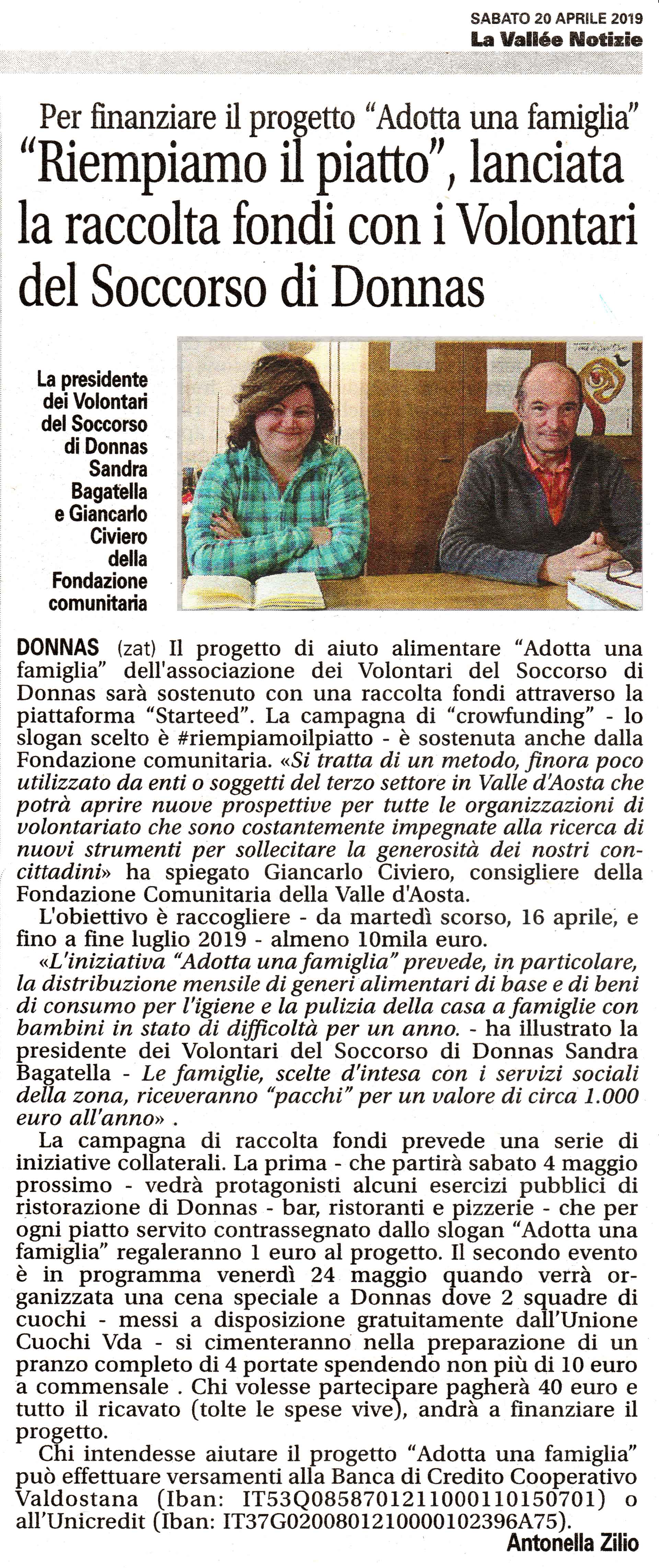 DONNAS (zat) Il progetto di aiuto alimentare "Adotta una famiglia" dell'associazione dei Volontari del Soccorso di Donnas sarà sostenuto con una raccolta fondi attraverso la piattaforma "Starteed". La campagna di "crowfunding" - lo slogan scelto è #riempiamoilpiatto - è sostenuta anche dalla Fondazione comunitaria. «Si tratta di un metodo, finora poco utilizzato da enti o soggetti del terzo settore in Valle ~sta che potrà aprire nuove prospettive per tutte le organizzazioni di volontariato che sono costantemente impegnate alla ricerca di nuovi strumenti per sollecitare la generosità dei nostri con-cittadini» ha spiegato Giancarlo Civiero, consigliere della Fondazione Comunitaria della Valle d'Aosta. L'obiettivo è raccogliere - da martedì scorso, 16 aprile, e fino a fine luglio 2019 - almeno 10mila euro. «L'iniziativa "Adotta una famiglia" prevede, in particolare, la distribuzione mensile di generi alimentari di base e di beni di consumo per l'igiene e la pulizia della casa a famiglie con bambini in stato di difficoltà per un anno. - ha illustrato la presidente dei Volontari del Soccorso di Donnas Sandra Bagatella - Le famiglie, scelte d'intesa con i servizi sociali della zona, riceveranno "pacchi" per un valore di circa 1.000 euro all'anno» . La campagna di raccolta fondi prevede una serie di iniziative collaterali. La prima - che partirà sabato 4 maggio prossimo - vedrà protagonisti alcuni esercizi pubblici di ristorazione di Donnas - bar, ristoranti e pizzerie - che per ogni piatto servito contrassegnato dallo slogan "Adotta una famiglia" regaleranno 1 euro al progetto. Il secondo evento è in programma venerdì 24 maggio quando verrà or-ganizzata una cena speciale a Donnas dove 2 squadre di cuochi - messi a disposizione gratuitamente dall'Unione Cuochi Vda - si cimenteranno nella preparazione di un pranzo completo di 4 portate spendendo non più di 10 euro a commensale Chi volesse partecipare pagherà 40 euro e tutto il ricavato (tolte le spese vive), andrà a finanziare il progetto. Chi intendesse aiutare il progetto "Adotta una famiglia" può effettuare versamenti alla Banca di Credito Cooperativo Valdostana (Iban: IT53Q0858701211000110150701) o all'Unicredit (Iban: IT37G0200801210000102396A75).