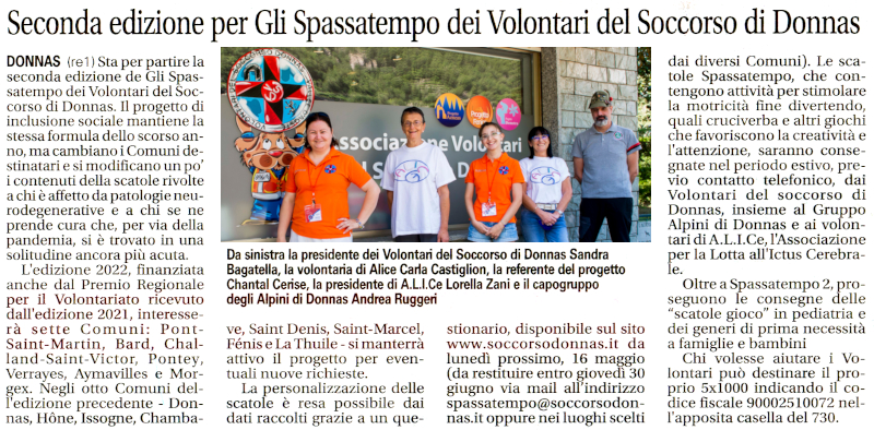 Le scatole Spassatempo, che contengono attività per stimolare la motricità fine divertendo, quali cruciverba e altri giochi che favoriscono la creatività e l'attenzione, saranno consegnate nel periodo estivo, previo contatto telefonico, dai Volontari del soccorso di Donnas, insieme al Gruppo Alpini di Donnas e ai volontari di A.L.I.Ce, l'Associazione per la Lotta all'Ictus Cerebrale.