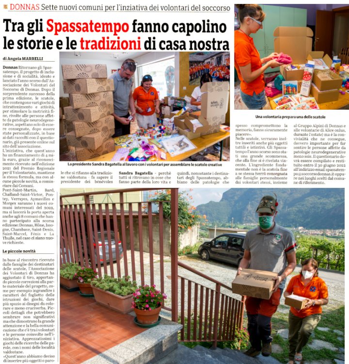 Ritornano Gli Spassatempo. Il progetto di inclusione e di socialità, ideato e lanciato l'anno scorso dai Volontari del Soccorso di Donnas. Dopo il sorprendente successo della prima edizione. le scatole che contengono vari giochi di intrattenimento e attività, per stimolare la motricità fine, rivolte alle persone affette da patologie neurodegenerative, aspettano solo di essere cosegnale. dopo essere state personalizzate, in base ai dati raccolti con il questionario, già presente online sul sito dell'Associazione.