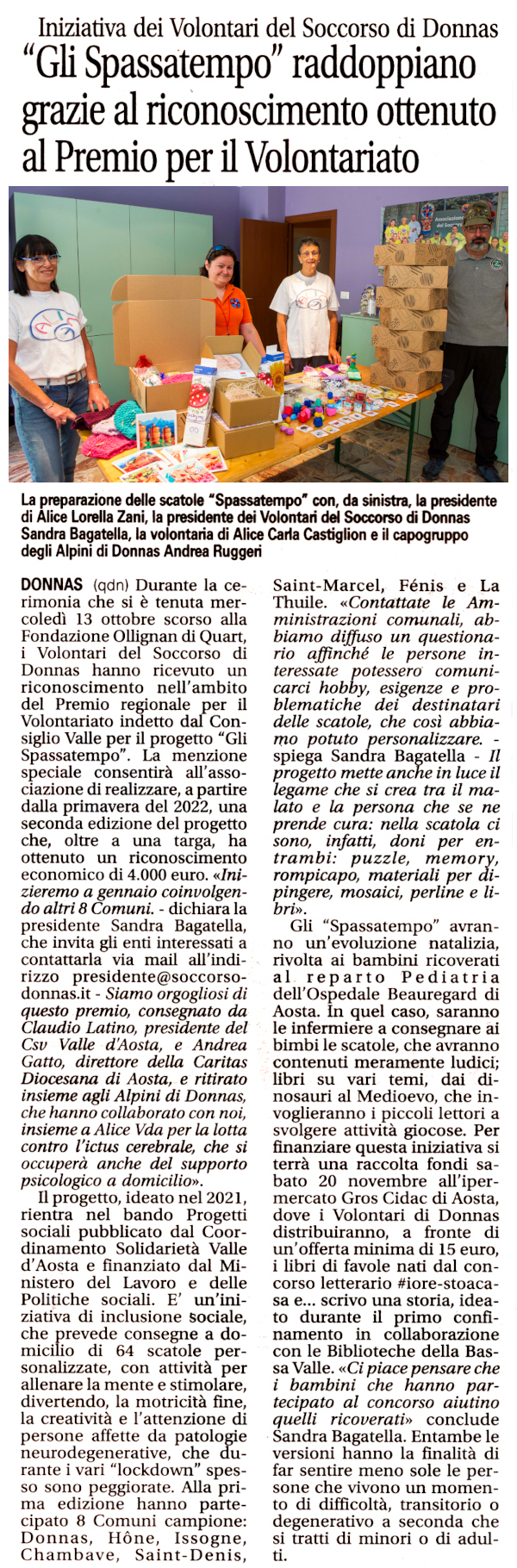 DONNAS (qdn) Durante la cerimonia che si è tenuta mercoledì 13 ottobre scorso alla Fondazione 0llignan di Quart, i Volontari del Soccorso di Donnas hanno ricevuto un riconoscimento nell'ambito del Premio regionale per il Volontariato indetto dal Consiglio Valle per il progetto "Gli Spassatempo".