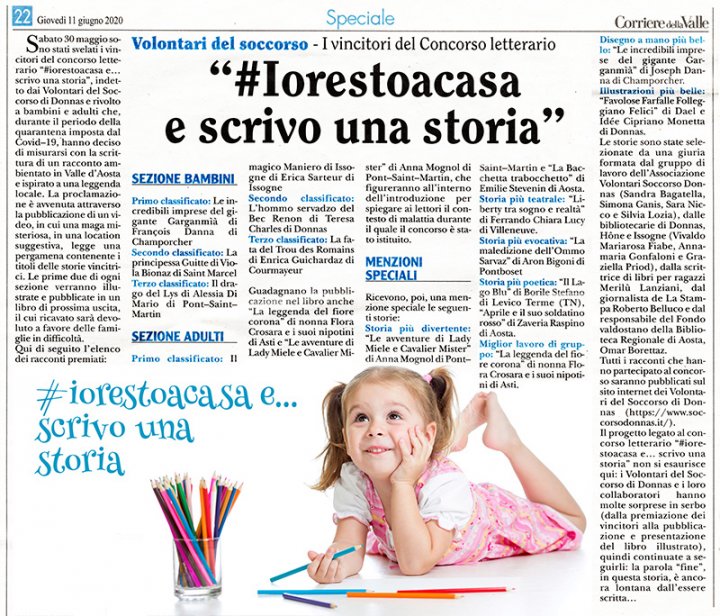 Sabato 30 maggio sono stati svelati i vincitori del concorso letterario "#iorestoacasa e... scrivo una storia", indetto dai Volontari del Soccorso di Donnas e rivolto a bambini e adulti che, durante il periodo della quarantena imposta dal Covid-19, hanno deciso di misurarsi con la scrittura di un racconto ambientato in Valle d'Aosta e ispirato a una leggenda locale. La proclamazione è avvenuta attraverso la pubblicazione di un video, in cui una maga misteriosa, in una location suggestiva, legge una pergamena contenente i titoli delle storie vincitrici.