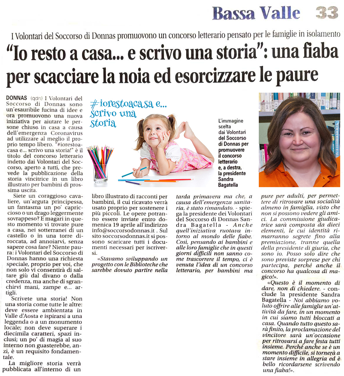 DONNAS (qdn) I Volontari del Soccorso di Donnas sono un'esauribile fucina di idee e ora promuovono una nuova iniziativa per aiutare le persone chiuse in casa a causa dell'emergenza Coronavirus ad utilizzare al meglio il proprio tempo libero. "#iorestoacasa e... scrivo una storia!" è il titolo del concorso letterario indetto dai Volontari del Soccorso, aperto a tutti, che prevede la pubblicazione della storia vincitrice in un libro illustrato per bambini di prossima uscita.