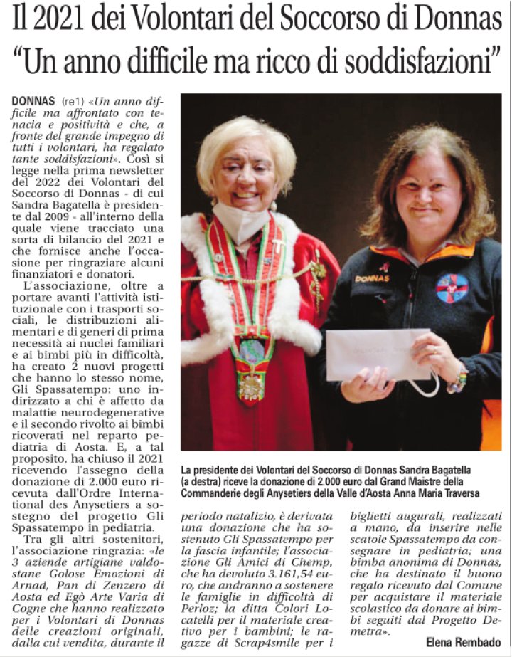E, a tal proposito, ha chiuso il 2021 ricevendo l'assegno della donazione dl 2.000 curo ricevuta dall'Ordre International des Anysetiers a sostegno del progetto Gli Spassatempo in pediatria. Tra gli altri sostenitori, l'associazione ringrazia: «le 3 aziende artigianali valdostane Golose Emozioni di Arnad, Pan di Zenzero di Aosta ed Egò Arte Varia di Cogne che hanno realizzato per i Volontari di Donnas delle creazioni originali, dalla cui vendita, durante iI periodo natalizio, è derivata una donazione che ha sostenuto Gli Spassatempo per la fascia infantile; l'associazione Gli Amici di Chernp, che ha devoluto 3.161,54 euro che andranno a sostenere le famiglie in difficolta di Perloz; la ditta Colori Locatelli per il materiale creativo per i bambini; le ragazze di Scrap4smile per i biglietti augurali realizzati a mano da inserire nelle scatole Spassatempo da consegnare in pediatria; una bimba anonima di Donnas, che ha destinato il buono regalo ricevuro dal Comune per acquistare il materiale scolastico da donare al bimbi seguiti dal Progetto Demetra». Elena Rernbado