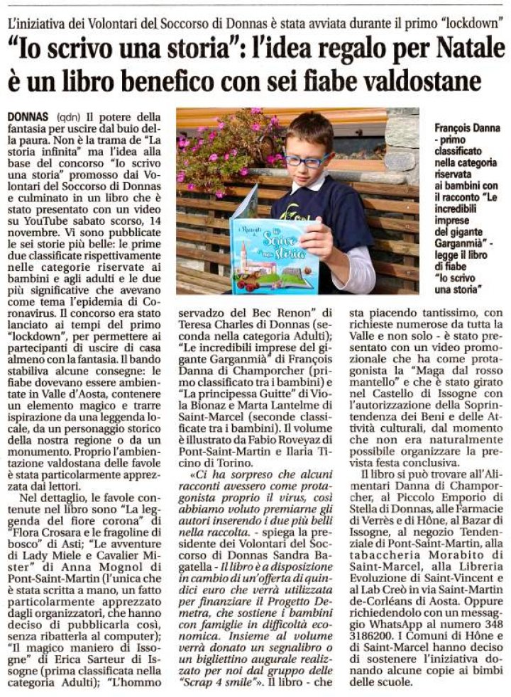 DONNAS (qdn) il potere della fantasia per uscire dal buio della paura. Non è la trama de "la storia infinita" ma l'idea alla base del concorso io scrivo una storia" promosso dai Volontari del Soccorso di Donnas e culminato in un libro che è stato presentato con un video su YouTube sabato scorso, 14 novembre.