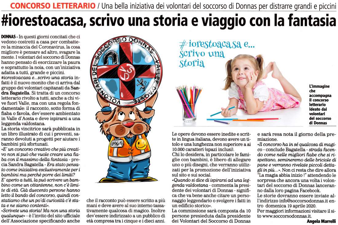 #iorestoacasa e...scrivo una storia infatti è il nuovo monito che ci arriva dal gruppo dei volontari capitanati da Sandra Bagatella. Si tratta di un concorso letterario rivolto a tutti, anche a chi vive fuori Valle, ma con una regola fondamentale: il racconto, sotto forma di fiaba o favola, dev'essere ambientato in Valle d'Aosta e deve ispirarsi a una leggenda valdostana.