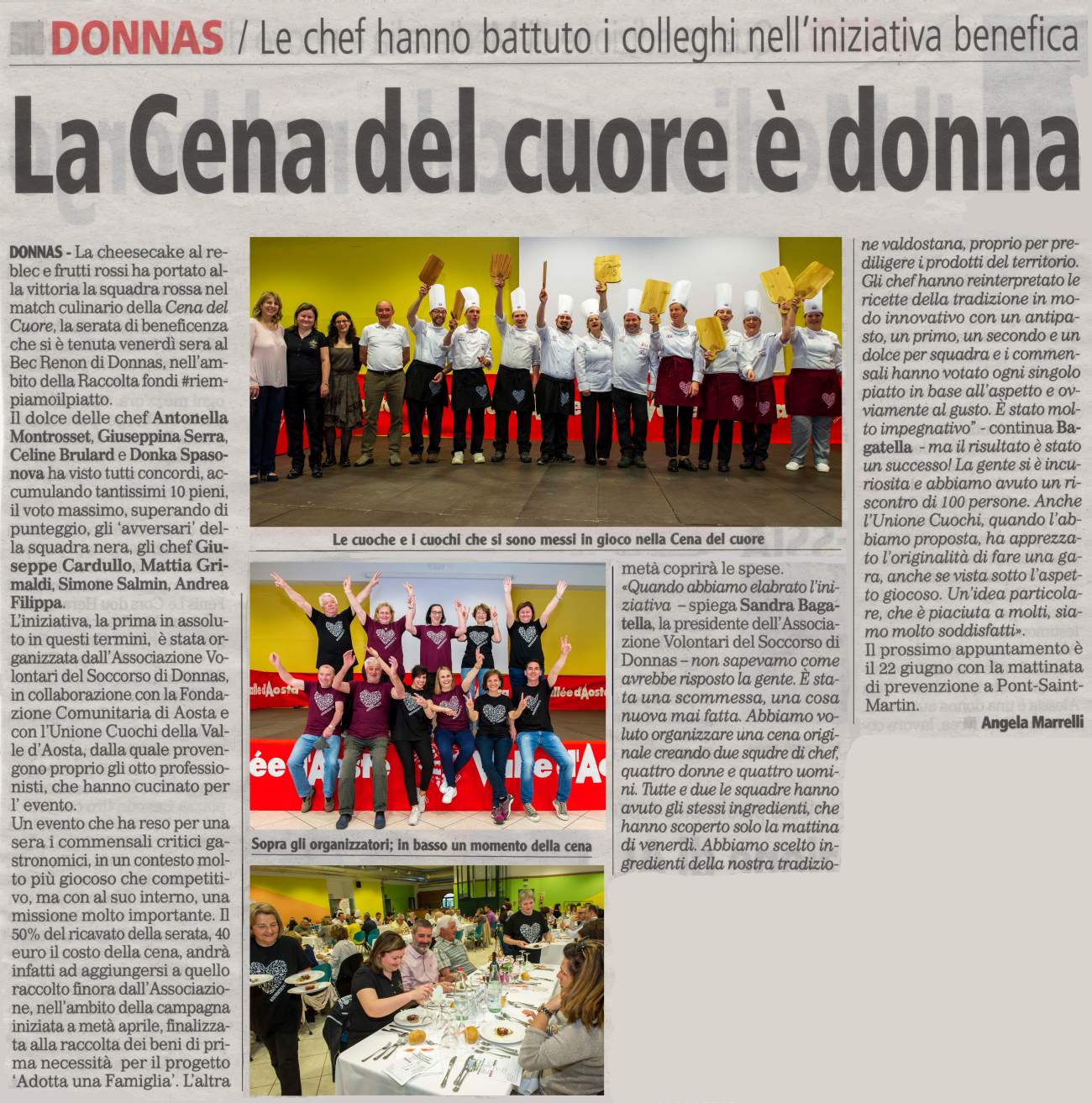 L'altra metà coprirà le spese. «Quando abbiamo elaborato l'iniziativa -spiega Sandra Bagatella, la presidente dell'Associazione Volontari del Soccorso di Donnas - non sapevamo come avrebbe risposto la gente. È stata una scommessa, una cosa nuova mai fatta. Abbiamo voluto organizzare una cena originale creando due squdre di chef, quattro donne e quattro uomini. Tutte e due le squadre hanno avuto gli stessi ingredienti, che hanno scoperto solo la mattina di venerdì.