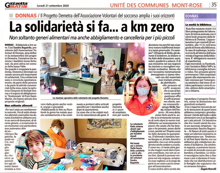 DONNAS - Solidarietà a km zero. Così Sandra Bagatella presidente dell'Associazione Volontari di Donnas, ama definire la metamorfosi del progetto Demetra l'iniziativa che sostiene i bambini meno fortunati, da anni attiva nei comuni della bassa Valle. Da quando è scoppiata la pandemia Demetra è diventato un canale ancora più importante di solidarietà. Una solidarietà nata e cresciuta spontaneamente, da parte delle persone e da parte di attività commerciali della zona, come la cartoleria l'Emporio di Stella a Donnas e il negozio di abbigliamento Tendenziale di Pont-Saint-Martin, che hanno attivato due proposte originali.