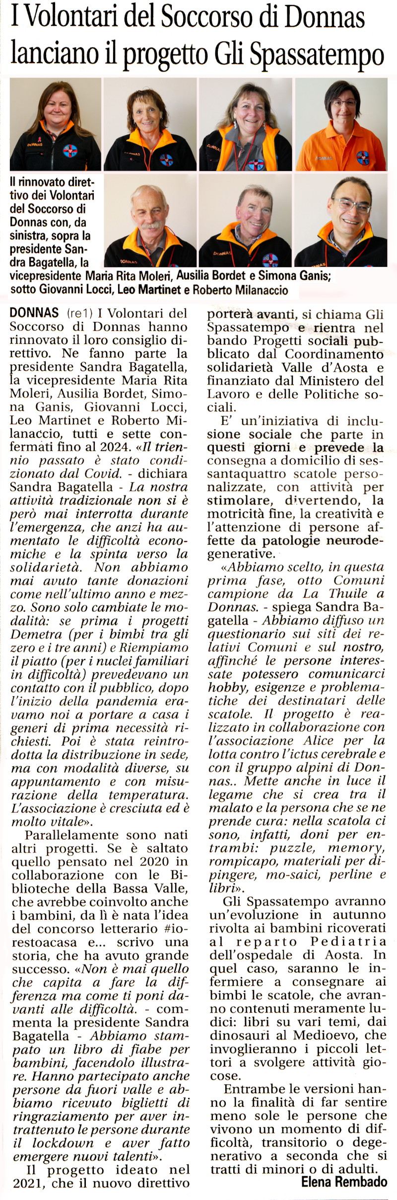 DONNAS. I Volontari del Soccorso di Donnas hanno rinnovato il loro consiglio direttivo. Ne fanno parte la presidente Sandra Bagatella, la vicepresidente Maria Rita Moleri, Ausilia Bordet, Simona Ganis, Giovanni Locci, Leo Martinet e Roberto Milanaccio, tutti e sette confermati fino al 2024.