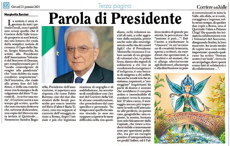 Dell'iniziativa. che risale alla prima fase del lockdown. e della sua conclusione con la stampa e la divulgazione del libro di racconti "... Io scrivo una storia", il Corriere aveva a suo tempo già scritto, quello che non era stato detto era che, nel mese di dicembre, una copia del libro era stata inviata al Quirinale... Nemmeno Sandra Bagatella, Presidente dell'associazione. si aspettava una risposta; chi come Fabio Roseyaz, uno dei due illustratori delle favole prescelte per essere inserite nel libro (l'altra è Ilaria Ticino) non era neppure al corrente dell'omaggio inviato a Roma, dopo l'iniziale e più che legittima reazione di orgoglio e di soddisfazione, ha accettato di condividere con i lettori del Corriere della Valle alcune considerazioni, che prescindono dal caso specifico e personale.