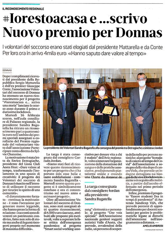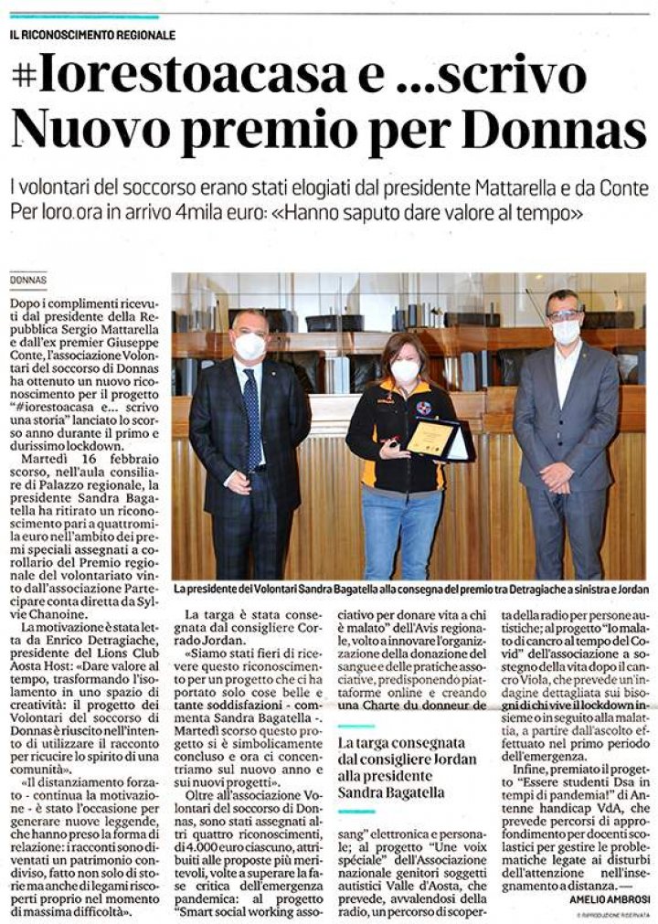 Dopo i complimenti ricevuti dal presidente della Repubblica Sergio Mattarella e dall'ex premier Giuseppe Conte, l'associazione Volontari del soccorso di Donnas ha ottenuto un nuovo riconoscimento per il progetto "#iorestoacasa e... scrivo una storia" lanciato lo scorso anno durante il primo e durissimo lockdown.