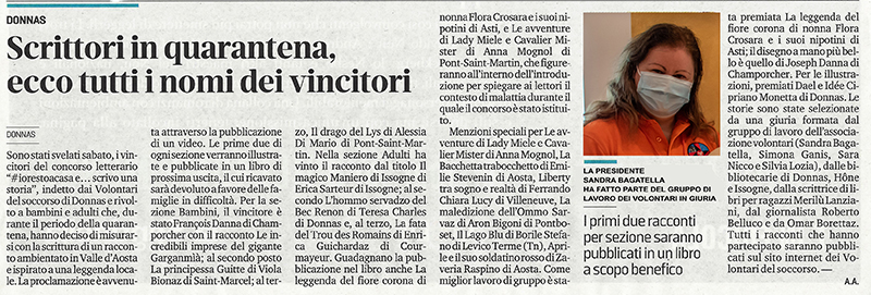Sono stati svelati sabato, i vincitori del concorso letterario "#iorestoacasa e... scrivo una storia", indetto dai Volontari del soccorso di Donnas e rivolto a bambini e adulti che, durante il periodo della quarantena, hanno deciso di misurarsi con la scrittura di un racconto ambientato in Valle d'Aosta e ispirato a una leggenda locale.