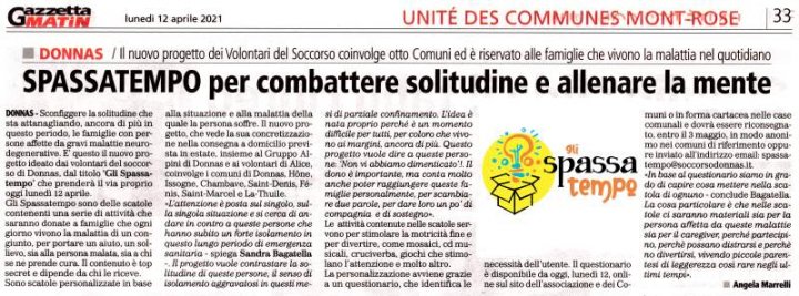 DONNAS -Sconfiggere la solitudine che sta attanagliando, ancora dl più in questo periodo, le famiglie con persone affette da gravi malattie neurodegenerative. E' questo il nuovo progetto ideato dal volontari del soccorso di Donnas, dal titolo 'Gli Spessatempo' che prenderà II via proprio oggi lunedì 12 aprile.