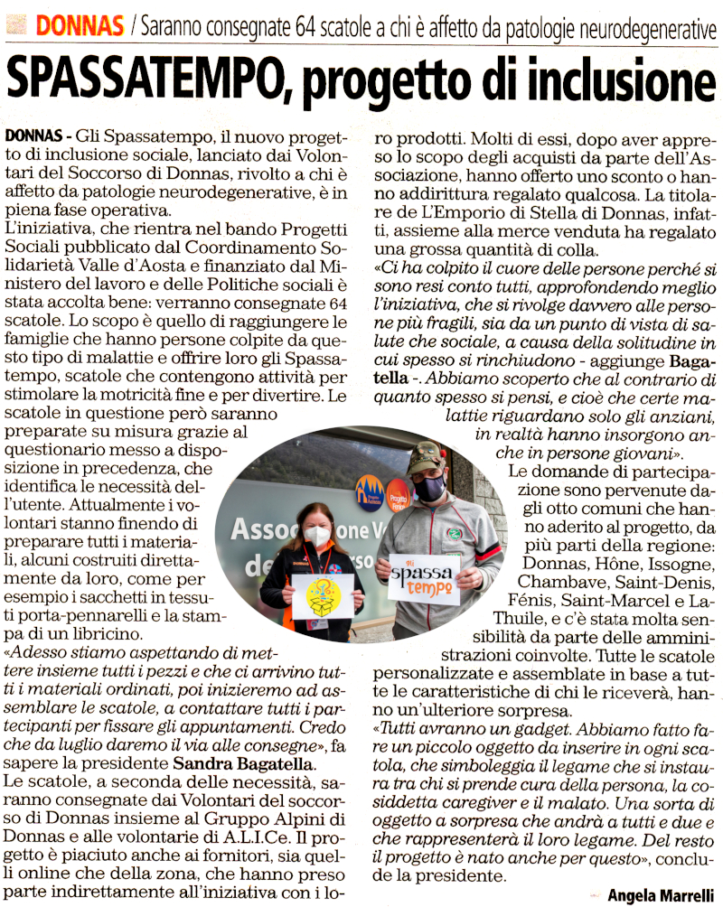 DONNAS- Gli Spassatempo, il nuovo progetto di inclusione sociale, lanciato dal Volontari del Soccorso di Donnas, rivolto a chi è affetto da patologie neurodegenerative, é in piena fase operativa.