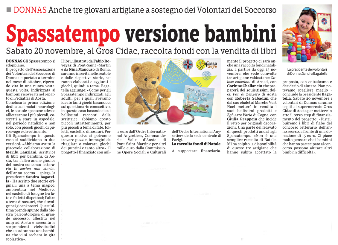 DONNAS - Gli Spassatempo si sdoppiano., il progetto dell'Associazione dei Volontari del Soccorso di Donnas e portato a termine nel mese di ottobre. riprende vita in una nuova veste, questa volta, indirizzata ai bambini ricoverati nel reparto di Pediatria di Aosta.
