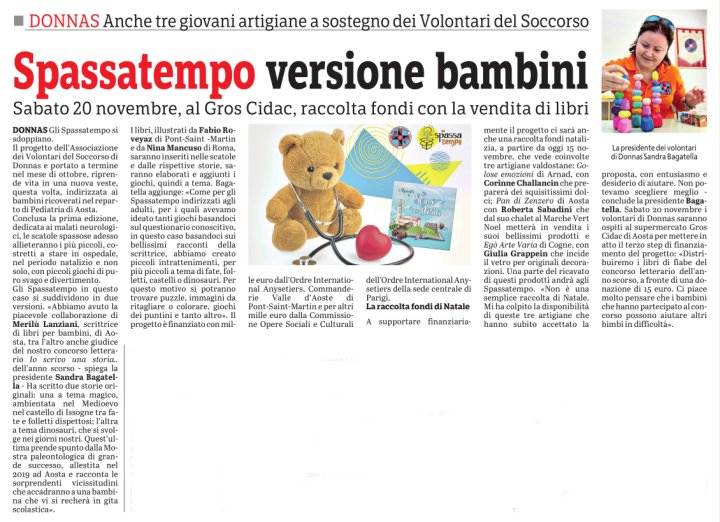 A su pportare finanziariamente il progetto ci sarà anche una raccolta fondi natalizia, a partire da oggi 15 novembre, che vede coinvolte tre artigiane valdostane: Golose emozioni di Arnad, con Corinne Challancin che preparerà dei squisitissimi dolci; Pan di Zenzero di Aosta con Roberta Sabadini che dal suo chalet al Marche Vert Noel metterà in vendita i suoi bellissimi prodotti e Egò Arte Varia di Cogne, con Giulia Grappein che incide il vetro per originali decorazioni. Una parte del ricavato di questi prodotti andrà agli Spassatempo, «Non è una semplice raccolta di Natale. Mi ha colpito la disponibilità di queste tre artigiane" - conclude la presidente Bagatella.