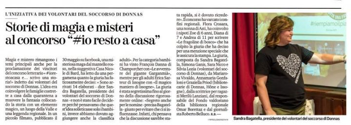 Magia e mistero rimangono i temi principali anche per la proclamazione dei vincitori del concorso letterario « #iorestoacasa e... scrivo una storia!» indetto dai volontari del soccorso di Donnas. L'idea era coinvolgere le famiglie costrette a casa dalla quarantena a muovere la fantasia collocando la storia con un elemento magico, un luogo della Valle e una leggenda regionale.