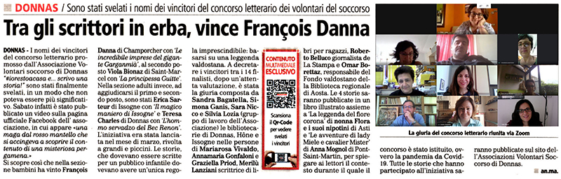 Si scopre così che nella sezio-ne bambini ha vinto François Danna di Champorcher con 'Le incredibile imprese del gigan-te Garganmià', al secondo posto Viola Bionaz di Saint-Marcel con 'La principessa Guitte'. Nella sezione adulti invece, ad aggiudicarsi il primo e secondo posto, sono stati Erica Sarteur di Issogne con 'Il magico maniero di Issogne' e Teresa Charles di Donnas con 'L'hommo servadzo del Bec Renon'.