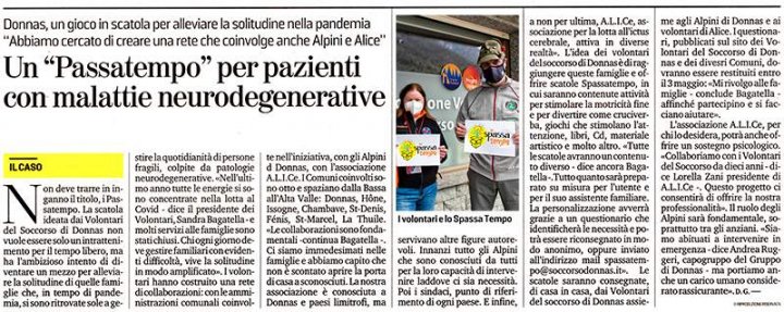 Non deve trarre in inganno il titolo, Gli Spassatempo. La scatola ideata dai Volontari del Soccorso di Donnas non vuole essere solo un intrattenimento per il tempo libero, ma ha l'ambizioso intento di diventate un mezzo per alleviare la solitudine di quelle famiglie che, in tempo di pendemia, si sono ritrovate sole a gestire la quotidianità di persone fragili, colpite da patologie neurodegenerative.